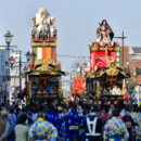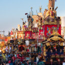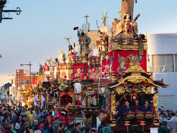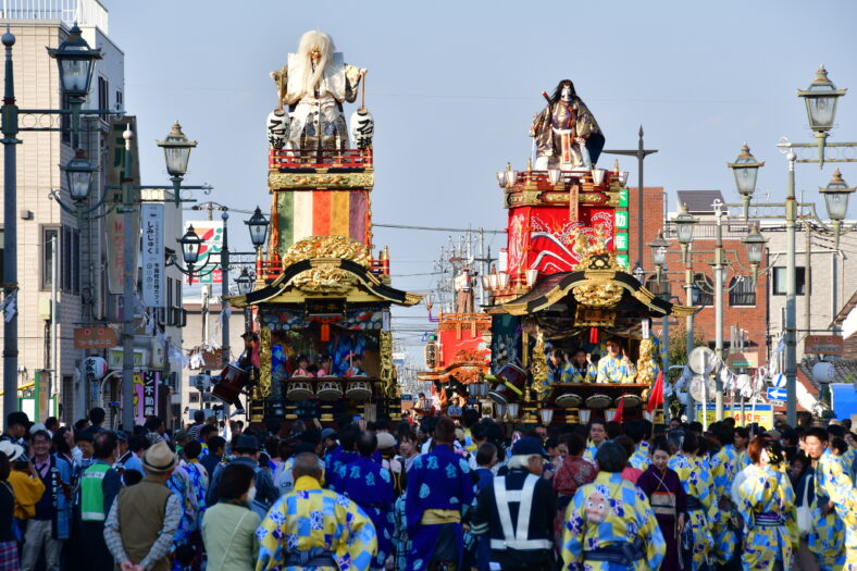 現在、山車は10基あり、うち8基は市指定文化財で、いずれも明治5年から大正13年までに建造されました。桃太郎、神功皇后、日本武尊、加藤清正など、人形を乗せた絢爛豪華な山車が晩秋の中山道を巡行するさまは、まさに時代絵巻そのもの。それぞれの山車の彫り物・刺繍も見事に施された一級品で、北関東随一の山車として有名です。夕闇が迫り、提灯に灯が入ると、山車はさらに優雅に姿を変え、見るものに、日本の古き祭り情緒を満喫させてくれることでしょう。