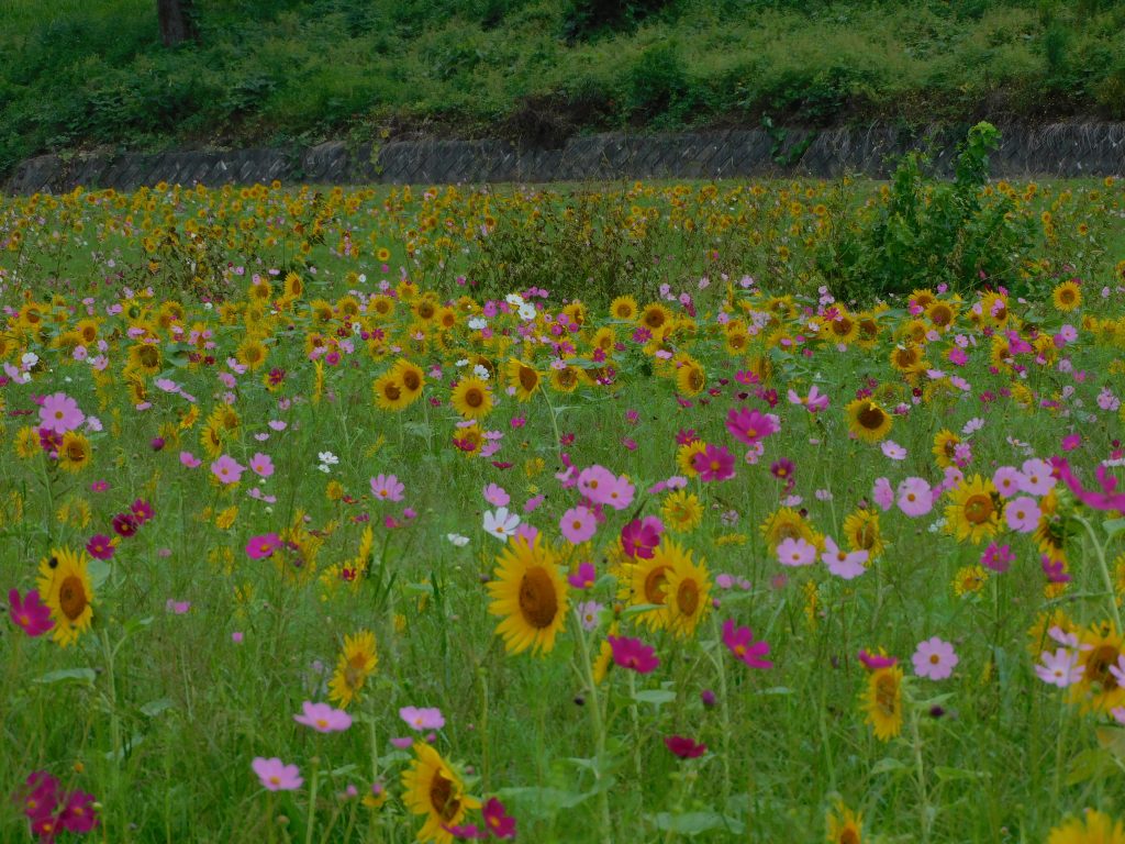 成身院入口のヒマワリ畑。昨年のコスモスの残りも咲いています。