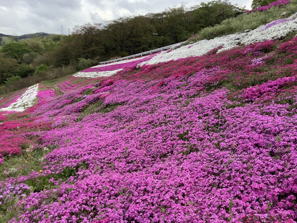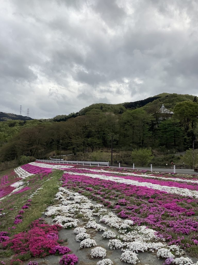 児玉総合運動公園の進入路沿いに植えられた白やピンクの芝桜。