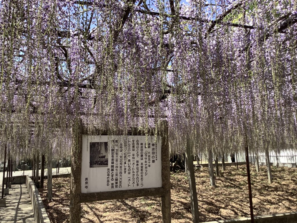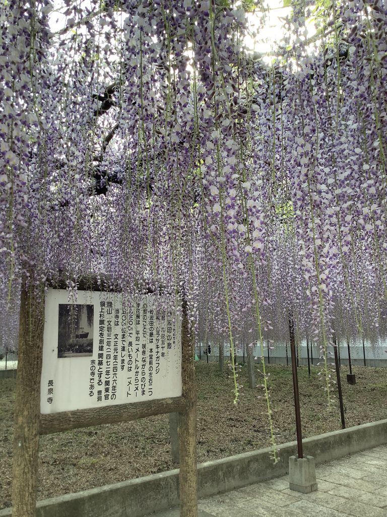 児玉33霊場31番札所、長泉寺の境内にある藤(ムラサキナガフジ)は、樹齢はおおよそ650年と推定され、埼玉県の天然記念物に指定されています。また他にも樹齢250年、350年とされる木もあり、花房は長いものでは1.5メートルにも達し、藤色、白やピンク等の見事な花を咲かせます。