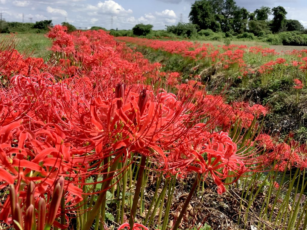本庄市児玉町秋山地内を流れる水押川の両岸1㎞に渡り、毎年、秋になると曼珠沙華が咲き、のどかな田園が哀愁あふれる風景となります。地元の風洞自治会の皆さまによって、美しい自然の景観が守り続けられています。