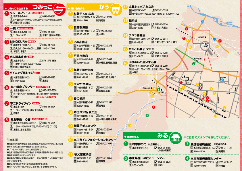 和菓子いいじま、笹屋製菓舗、こめ吉商店、戸谷八商店、御菓子司せきね、マメヤ文具店、香の根岸、本庄パン処麦と豆、御菓子処こまつや、本庄市インフォメーションセンター、秩父家菓子店、文具ショップみなみ、梅月堂、チハラ金物店、パンとお菓子マロン、ふれあいの里いずみ亭