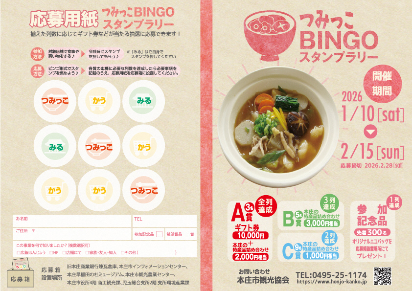 もちもち食感とたっぷり野菜がおいしい本庄名物「つみっこ」を食べて、市内のお店や観光名所を巡る「つみっこBINGOスタンプラリー」を開催します。